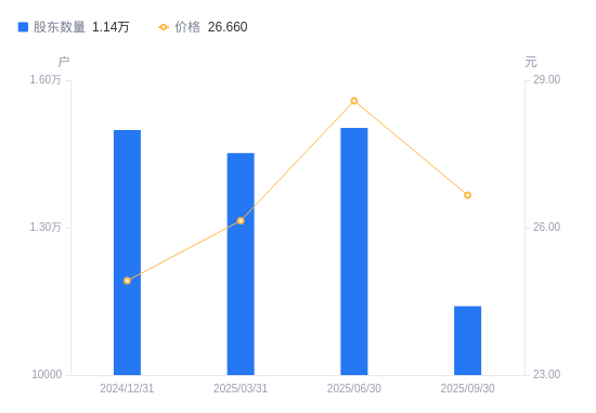 近一年(2024年9月30日至2025年9月30日),药易购A股股东户数从1.29万户,减低至1.14万户,降幅11.35%,区间股价上涨29.17%。