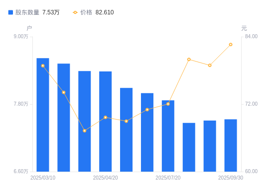 近一年(2024年9月30日至2025年9月30日),汇顶科技A股股东户数从6.31万户,增加至7.53万户,增幅19.44%,区间股价上涨30.70%。