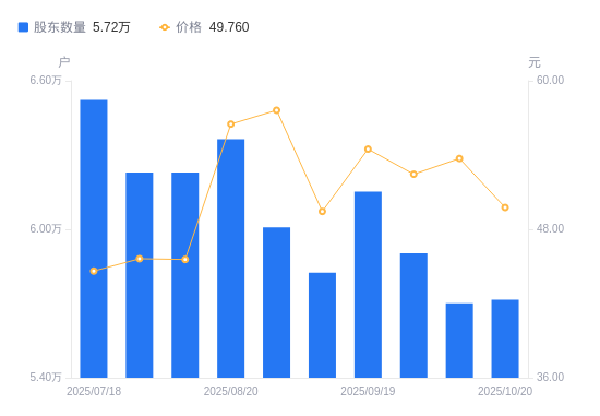 近一年(2024年11月8日至2025年10月20日),高新发展A股股东户数从8.97万户,减低至5.72万户,降幅36.27%,区间股价下跌28.73%。