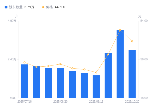 近一年(2024年10月31日至2025年10月20日),哈焊华通A股股东户数从1.1万户,增加至2.79万户,增幅154.05%,区间股价上涨146.40%。