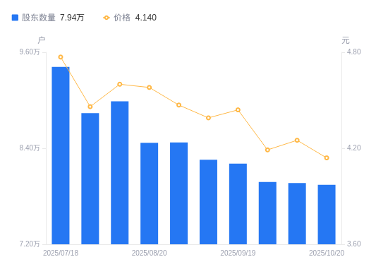 近一年(2024年10月31日至2025年10月20日),保税科技A股股东户数从5.6万户,增加至7.94万户,增幅41.97%,区间股价上涨22.85%。
