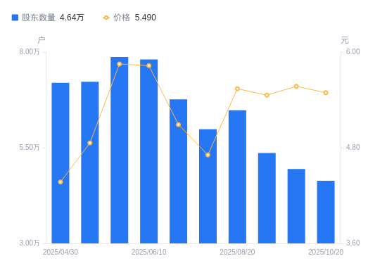 近一年(2024年11月20日至2025年10月20日),新金路A股股东户数从4.3万户,增加至4.64万户,增幅7.79%,区间股价上涨42.23%。