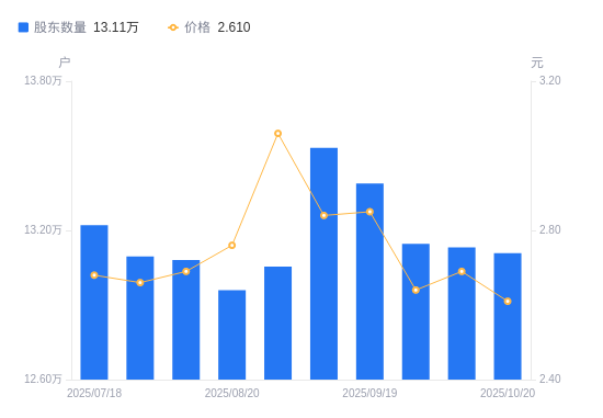 近一年(2024年10月31日至2025年10月20日),国安股份A股股东户数从15.19万户,减低至13.11万户,降幅13.72%,区间股价下跌23.01%。