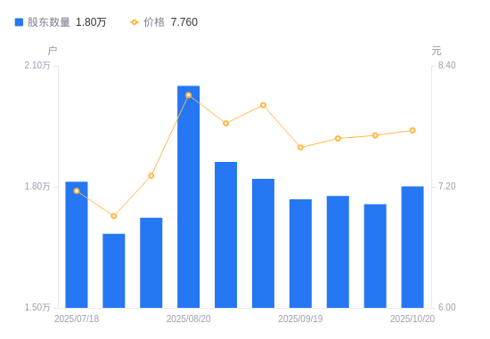 近一年(2024年10月10日至2025年10月10日),日科化学A股股东户数从1.38万户,增加至1.76万户,增幅27.42%,区间股价上涨50.29%。