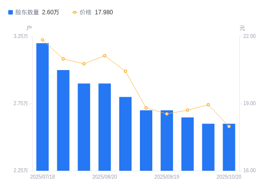 近一年(2024年11月8日至2025年10月20日),会畅通讯A股股东户数从3.19万户,减低至2.6万户,降幅18.50%,区间股价下跌28.99%。