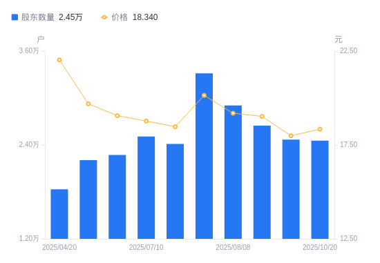 近一年(2024年12月20日至2025年10月20日),爱婴室A股股东户数从1.29万户,增加至2.45万户,增幅90.29%,区间股价下跌18.19%。
