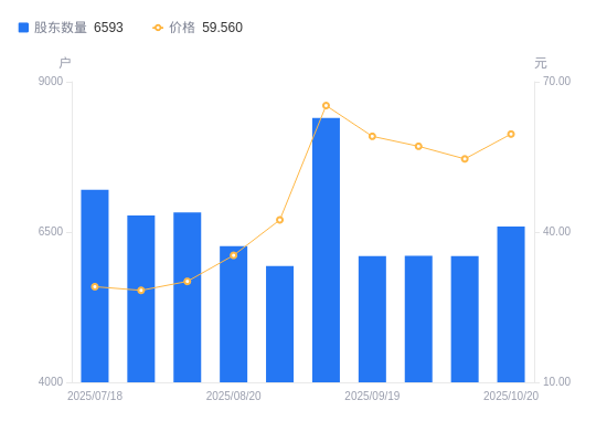近一年(2024年9月30日至2025年9月30日),开创电气A股股东户数从8781户,减低至6106户,降幅30.46%,区间股价上涨202.70%。