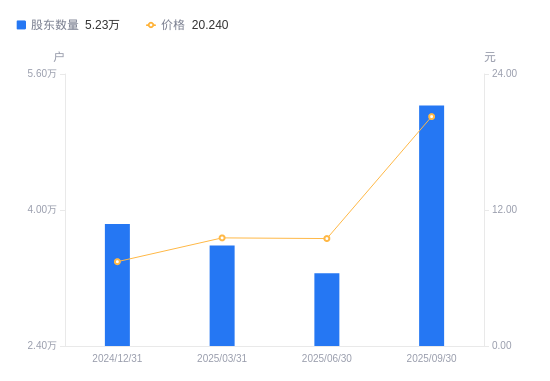 近一年(2024年9月30日至2025年9月30日),东材科技A股股东户数从3.52万户,增加至5.23万户,增幅48.80%,区间股价上涨160.49%。