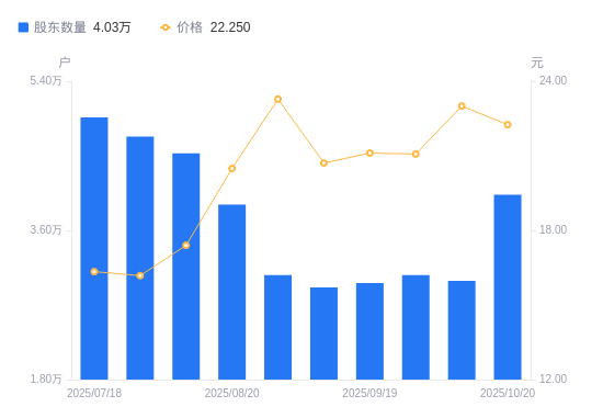 近一年(2024年10月31日至2025年10月20日),伊戈尔A股股东户数从4.62万户,减低至4.03万户,降幅12.83%,区间股价上涨33.70%。