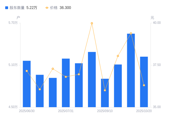 近一年(2024年11月8日至2025年10月20日),容大感光A股股东户数从6.53万户,减低至5.22万户,降幅20.08%,区间股价下跌21.78%。