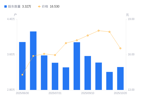 近一年(2024年10月31日至2025年10月20日),圣农发展A股股东户数从3.91万户,减低至3.32万户,降幅15.04%,区间股价上涨14.54%。