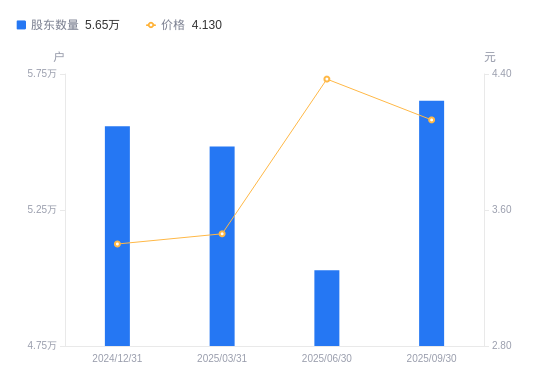 近一年(2024年9月30日至2025年9月30日),京能电力A股股东户数从5.71万户,减低至5.65万户,降幅1.07%,区间股价上涨24.02%。