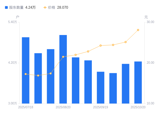 近一年(2024年9月30日至2025年9月30日),东方钽业A股股东户数从4.4万户,减低至3.9万户,降幅11.49%,区间股价上涨123.08%。