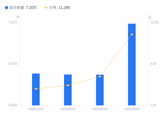 近一年(2024年9月30日至2025年9月30日),骆驼股份A股股东户数从5.01万户,增加至7.16万户,增幅42.92%,区间股价上涨43.33%。