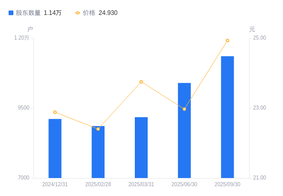 近一年(2024年9月30日至2025年9月30日),茶花股份A股股东户数从1.05万户,增加至1.14万户,增幅8.33%,区间股价上涨76.18%。