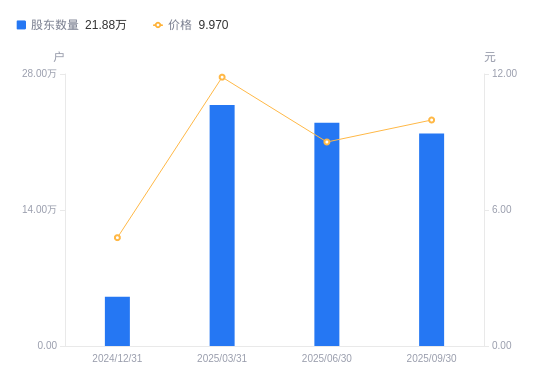 近一年(2024年9月30日至2025年9月30日),杭钢股份A股股东户数从4.39万户,增加至21.88万户,增幅398.22%,区间股价上涨149.87%。