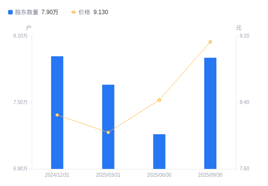 10月24日消息,数据显示,截至2025年9月30日,中体产业A股股东总户数为7.9万户,较上期(2025年6月30日)增加6917户,增幅9.59%。公司最新A股总股本为9.6亿股,其中流通A股9.6亿股,户均持有流通A股数量为1.21万股,较上期减少1164.01股,降幅8.75%;户均持流通A股市值11.08万元,较上期减少1315.73元,降幅1.17%。