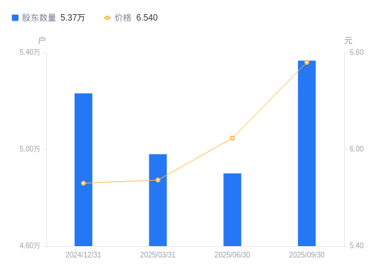 近一年(2024年9月30日至2025年9月30日),亚宝药业A股股东户数从5.43万户,减低至5.37万户,降幅1.09%,区间股价上涨18.05%。
