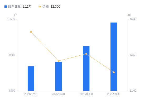 近一年(2024年9月30日至2025年9月30日),和仁科技A股股东户数从9299户,增加至1.11万户,增幅19.13%,区间股价上涨2.97%。