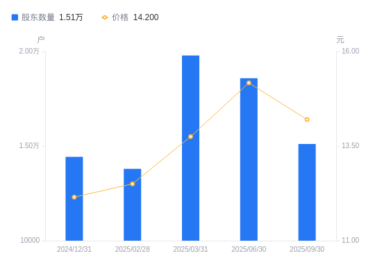近一年(2024年9月30日至2025年9月30日),怡达股份A股股东户数从1.59万户,减低至1.51万户,降幅4.81%,区间股价上涨19.93%。
