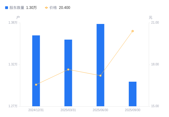 近一年(2024年9月30日至2025年9月30日),确成股份A股股东户数从1.33万户,减低至1.3万户,降幅1.90%,区间股价上涨21.71%。