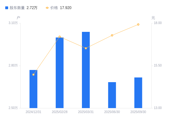 近一年(2024年9月30日至2025年9月30日),万东医疗A股股东户数从2.94万户,减低至2.72万户,降幅7.50%,区间股价上涨31.28%。