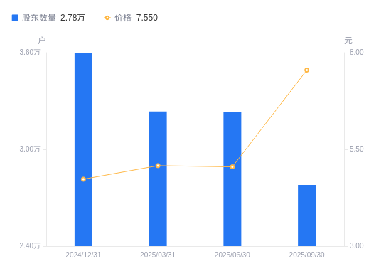 近一年(2024年9月30日至2025年9月30日),黑牡丹A股股东户数从3.95万户,减低至2.78万户,降幅29.69%,区间股价上涨65.61%。