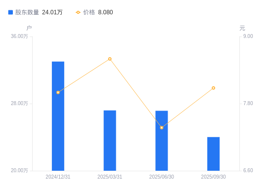 近一年(2024年9月30日至2025年9月30日),北汽蓝谷A股股东户数从32.43万户,减低至24.01万户,降幅25.96%,区间股价上涨10.08%。