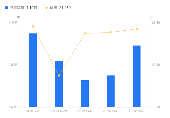 10月24日消息,数据显示,截至2025年9月30日,江中药业A股股东总户数为4.19万户,较上期(2025年6月30日)增加2843户,增幅7.29%。公司最新A股总股本为6.35亿股,其中流通A股6.27亿股,户均持有流通A股数量为1.5万股,较上期减少1092.14股,降幅6.79%;户均持流通A股市值32.12万元,较上期减少2.18万元,降幅6.36%。