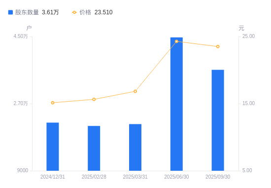 近一年(2024年9月30日至2025年9月30日),北矿科技A股股东户数从2.19万户,增加至3.61万户,增幅65.00%,区间股价上涨68.23%。