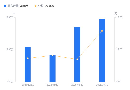 近一年(2024年9月30日至2025年9月30日),通润装备A股股东户数从2.06万户,增加至3.58万户,增幅73.25%,区间股价上涨48.71%。