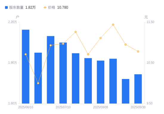 10月24日消息,数据显示,截至2025年9月30日,瑞丰高材A股股东总户数为1.82万户,较上期(2025年8月29日)增加352户,增幅1.98%。公司最新A股总股本为2.5亿股,其中流通A股1.94亿股,户均持有流通A股数量为1.07万股,较上期减少214.77股,降幅1.97%;户均持流通A股市值11.54万元,较上期减少4172.21元,降幅3.49%。