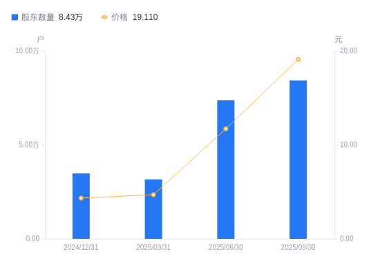 近一年(2024年9月30日至2025年9月30日),汇金股份A股股东户数从3.88万户,增加至8.43万户,增幅117.48%,区间股价上涨539.13%。
