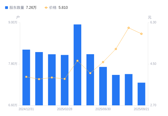 近一年(2024年9月30日至2025年9月30日),皖维高新A股股东户数从8.65万户,减低至8.23万户,降幅4.90%,区间股价上涨69.21%。