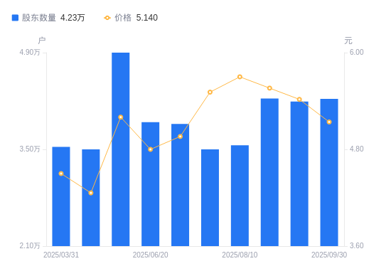 近一年(2024年9月30日至2025年9月30日),悦达投资A股股东户数从3.79万户,增加至4.23万户,增幅11.70%,区间股价上涨31.46%。