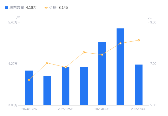 近一年(2024年9月30日至2025年9月30日),厦门港务A股股东户数从4.01万户,增加至4.18万户,增幅4.34%,区间股价上涨38.83%。