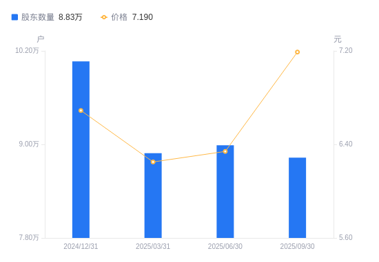 10月24日消息,数据显示,截至2025年9月30日,聚飞光电A股股东总户数为8.83万户,较上期(2025年6月30日)减少1587户,降幅1.77%。公司最新A股总股本为14.16亿股,其中流通A股13.28亿股,户均持有流通A股数量为1.5万股,较上期增加346.79股,增幅2.36%;户均持流通A股市值10.81万元,较上期增加1.5万元,增幅16.08%。
