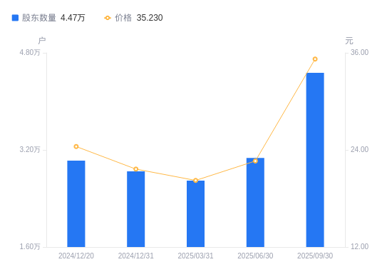 近一年(2024年9月30日至2025年9月30日),苏大维格A股股东户数从2.77万户,增加至4.47万户,增幅61.59%,区间股价上涨95.29%。