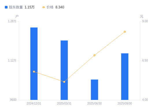 近一年(2024年9月30日至2025年9月30日),*ST天山A股股东户数从1.39万户,减低至1.15万户,降幅17.56%,区间股价上涨34.73%。