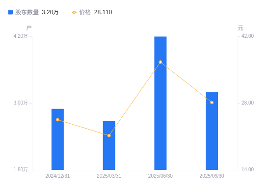 近一年(2024年9月30日至2025年9月30日),天利科技A股股东户数从2.81万户,增加至3.2万户,增幅13.64%,区间股价上涨70.78%。