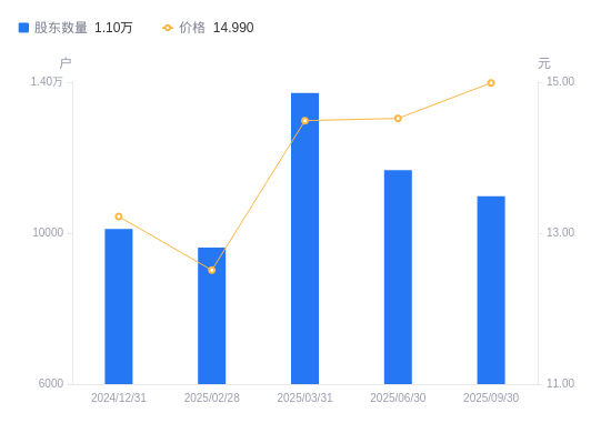 近一年(2024年9月30日至2025年9月30日),国光股份A股股东户数从1.12万户,减低至1.1万户,降幅1.68%,区间股价上涨25.97%。