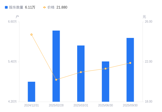 10月24日消息,数据显示,截至2025年9月30日,太极集团A股股东总户数为6.11万户,较上期(2025年6月30日)增加7053户,增幅13.04%。公司最新A股总股本为5.51亿股,其中流通A股5.51亿股,户均持有流通A股数量为9018.8股,较上期减少1277.22股,降幅12.40%;户均持流通A股市值19.73万元,较上期减少2.21万元,降幅10.06%。