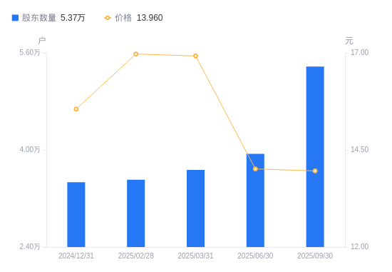 近一年(2024年9月30日至2025年9月30日),昆药集团A股股东户数从3.7万户,增加至5.37万户,增幅45.05%,区间股价下跌2.92%。
