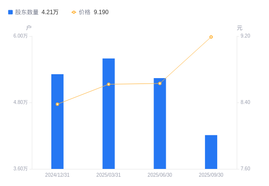 近一年(2024年9月30日至2025年9月30日),赣能股份A股股东户数从5.85万户,减低至4.21万户,降幅28.03%,区间股价上涨15.31%。