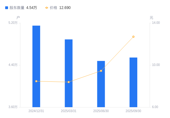 近一年(2024年9月30日至2025年9月30日),大中矿业A股股东户数从4.98万户,减低至4.54万户,降幅8.79%,区间股价上涨55.97%。