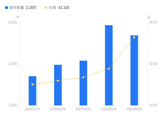 近一年(2024年9月30日至2025年9月30日),华正新材A股股东户数从1.86万户,增加至2.28万户,增幅22.54%,区间股价上涨83.28%。