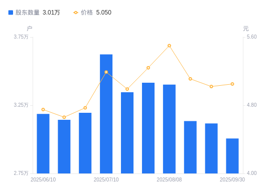 近一年(2024年9月30日至2025年9月30日),科顺股份A股股东户数从3.52万户,减低至3.01万户,降幅14.56%,区间股价上涨5.19%。