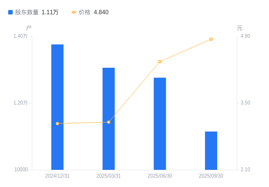 近一年(2024年9月30日至2025年9月30日),*ST恒久A股股东户数从1.61万户,减低至1.11万户,降幅30.64%,区间股价上涨143.22%。