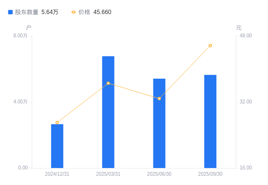 近一年(2024年9月30日至2025年9月30日),新莱应材A股股东户数从2.86万户,增加至5.64万户,增幅97.08%,区间股价上涨124.82%。