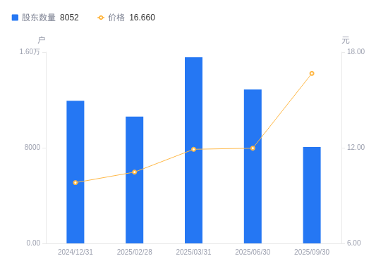 近一年(2024年9月30日至2025年9月30日),西大门A股股东户数从8479户,减低至8052户,降幅5.04%,区间股价上涨90.18%。